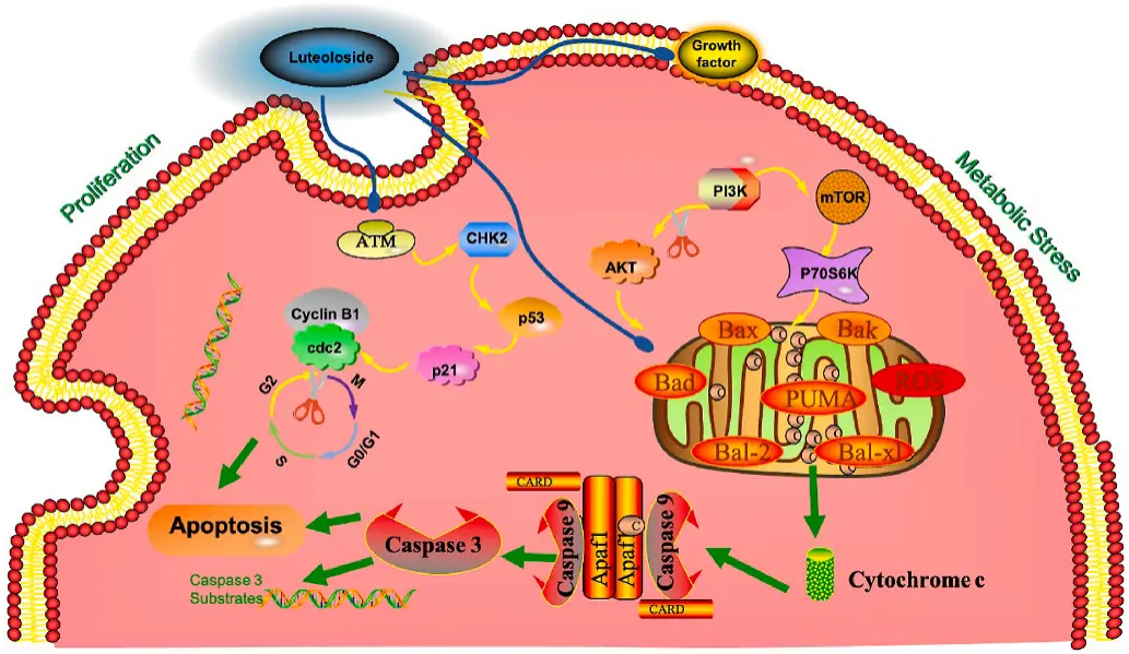 3.結直腸癌:木犀草苷通過雙重機制(線粒體凋亡通路激活和PI3K/AKT/mTOR通路抑制)抑制HCT116細胞增殖并誘導凋亡,其IC50為44.1μM,可作為功能性膳食成分或個性化營養(yǎng)治療的潛在候選物,為結直腸癌的天然藥物開發(fā)提供理論依據(jù)。[7]