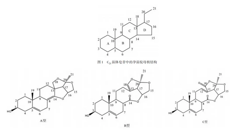 1、甾體皂苷苷元均以孕甾烷(圖1)或其異構(gòu)體為基本骨架,C、D環(huán)易發(fā)生變形,D環(huán)氧化成3個(gè)四氫呋喃環(huán)(A型)或苷元骨架中的六元C環(huán)和五元D環(huán)氧化斷裂成九元環(huán)的飽和內(nèi)酯(B型)及不飽和內(nèi)酯(C型);