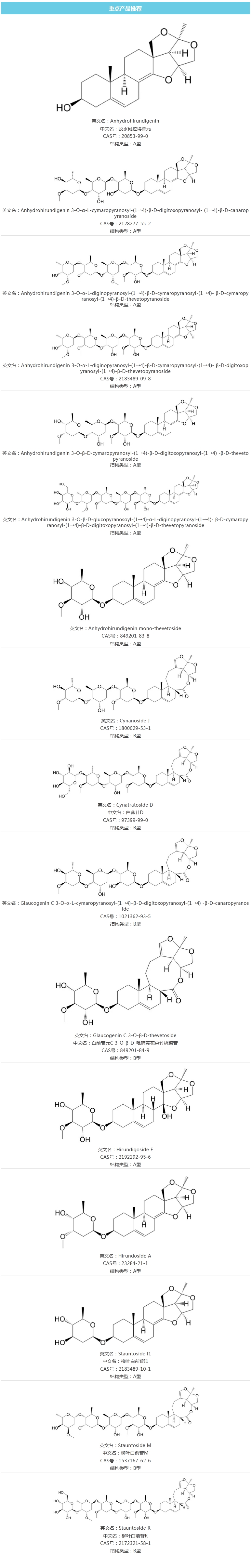 目前我司已有多種白前C21甾體皂苷類化合物,均為現(xiàn)貨,其中絕大部分為獨(dú)家化合物,歡迎咨詢!