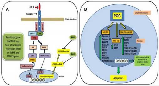 1、抗三陰性乳腺癌(triple-negative breast cancer,TNBC):Mendonca等的研究表明PGG具有抗癌能力,能夠通過增加TNF和TNF家族受體的表達(dá)來抑制腫瘤細(xì)胞增殖和GRO-α釋放,并誘導(dǎo)凋亡(圖一)。因此,建議將PGG作為TNBC的輔助療法,以提高化療效果并防止癌癥進(jìn)展。[2]
