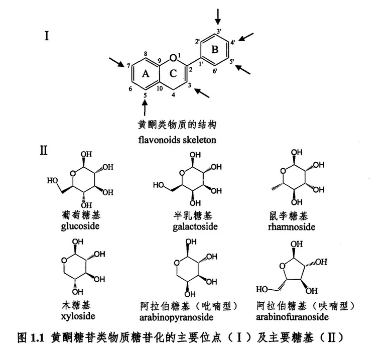 黃酮糖苷主要是由黃酮基本骨架主要位置上的氧化作用所形成的。糖取代基多以氫氧化形式與黃酮碳骨架相連,形成O-糖苷,也有少數(shù)與黃酮A環(huán)上的C原子直接相連形成C-糖苷,如牡荊素、葛根素等。糖基主要包括葡萄糖、半乳糖、鼠李糖、木糖、阿拉伯糖等,且部分糖基有乙?;?、咖啡酰化、香豆?;?、沒食子?;痊F(xiàn)象。