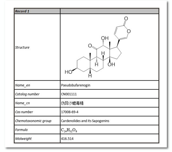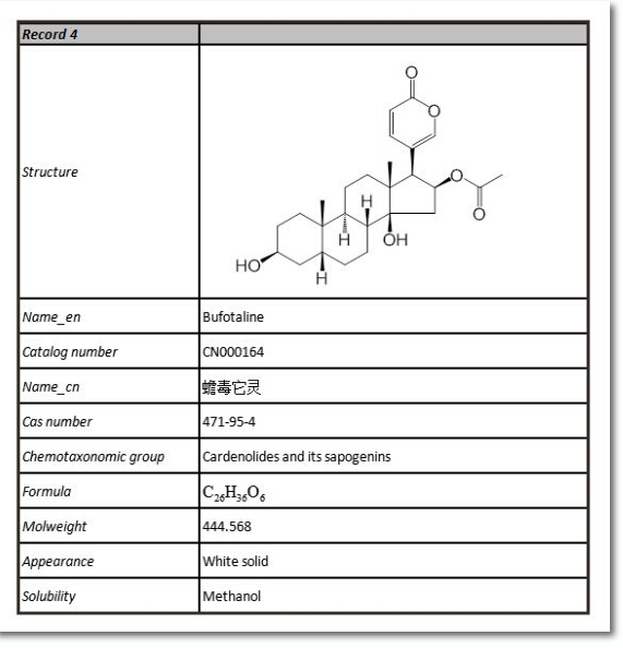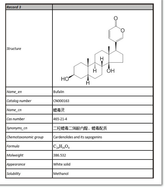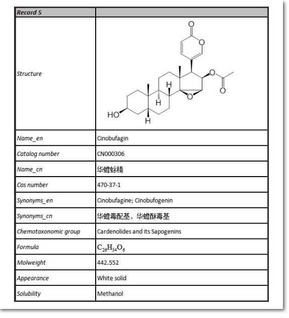 普思生物是一家專業(yè)從事天然藥物分離純化并提供藥物技術研究服務的國家高新技術企業(yè)。目前我司共有20多種蟾酥系列活性成分——酯蟾毒配基、蟾毒靈、蟾毒它靈、遠華蟾蜍精、沙蟾毒精、日蟾蜍他靈、華蟾毒它靈、偽異沙蟾毒精、華蟾蜍精、去乙酰華蟾毒精、去乙酰華蟾毒它靈、南美蟾毒精、蟾蜍色胺、蟾蜍它里定、嚏根草醇、19-羥基蟾毒靈、華蟾毒精醇、酯蟾毒精、異沙蟾毒精、19-氧代華蟾毒它靈、19-氧代華蟾毒精等,部分產(chǎn)品信息如下: