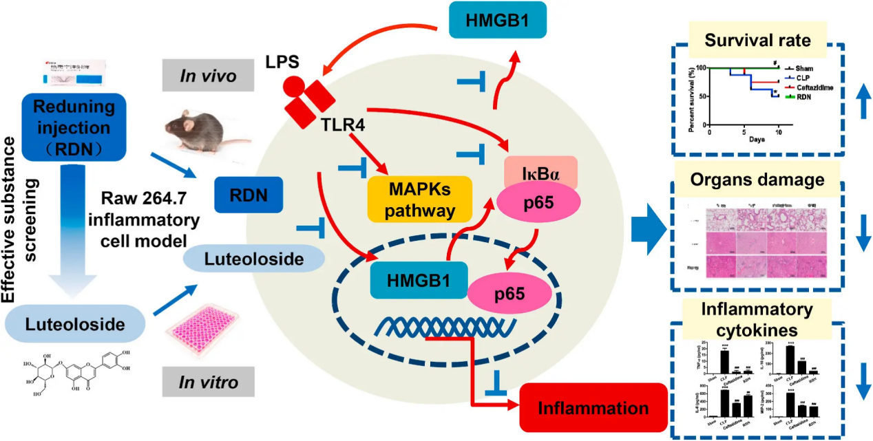 3.膿毒癥:木犀草苷通過抑制HMGB1的核質轉移及分泌,阻斷下游TLR4/MyD88依賴的NF-κB和MAPKs信號通路激活,從而緩解過度炎癥反應。該作用機制為膿毒癥治療提供了新靶點。[4]