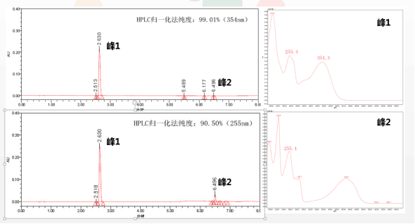 解決方案:選擇對(duì)照品與雜質(zhì)具有相似吸收特征的波長(zhǎng),純度結(jié)果會(huì)更趨近真實(shí)值(如示圖選擇255nm檢測(cè))。