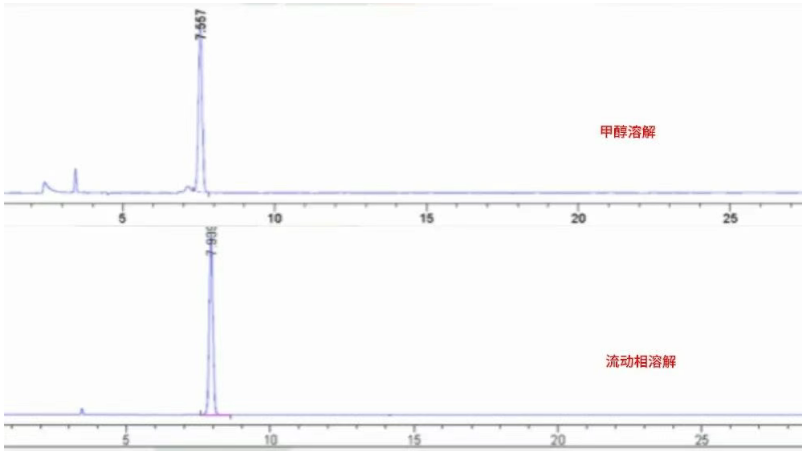 原因:對照品在溶劑中發(fā)生了降解,降解產(chǎn)物可能與主成分共洗脫,導(dǎo)致峰形拖尾、展寬。