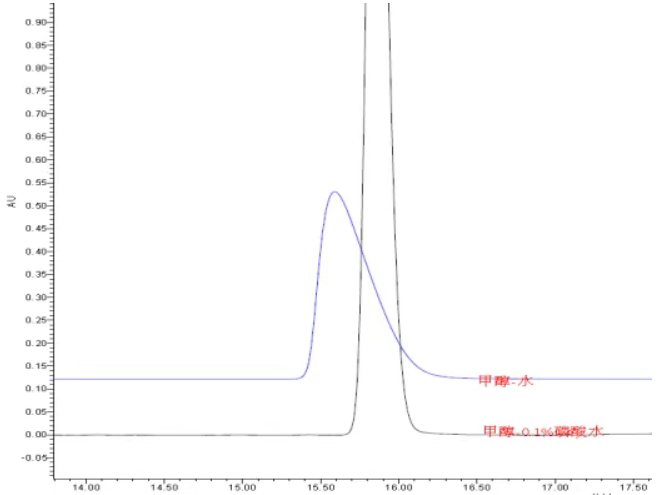 原因:當(dāng)pH值不適當(dāng)時,對照品與固定相的相互作用不均勻,導(dǎo)致部分分子提前或延遲流出,形成前沿峰或拖尾峰。