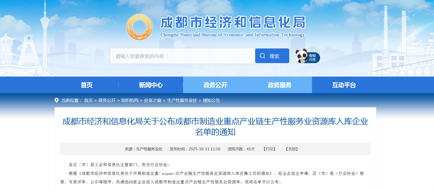 今日,成都市經(jīng)濟(jì)和信息化局公布“成都市制造業(yè)重點產(chǎn)業(yè)鏈生產(chǎn)性服務(wù)業(yè)資源庫擬入庫名單”。