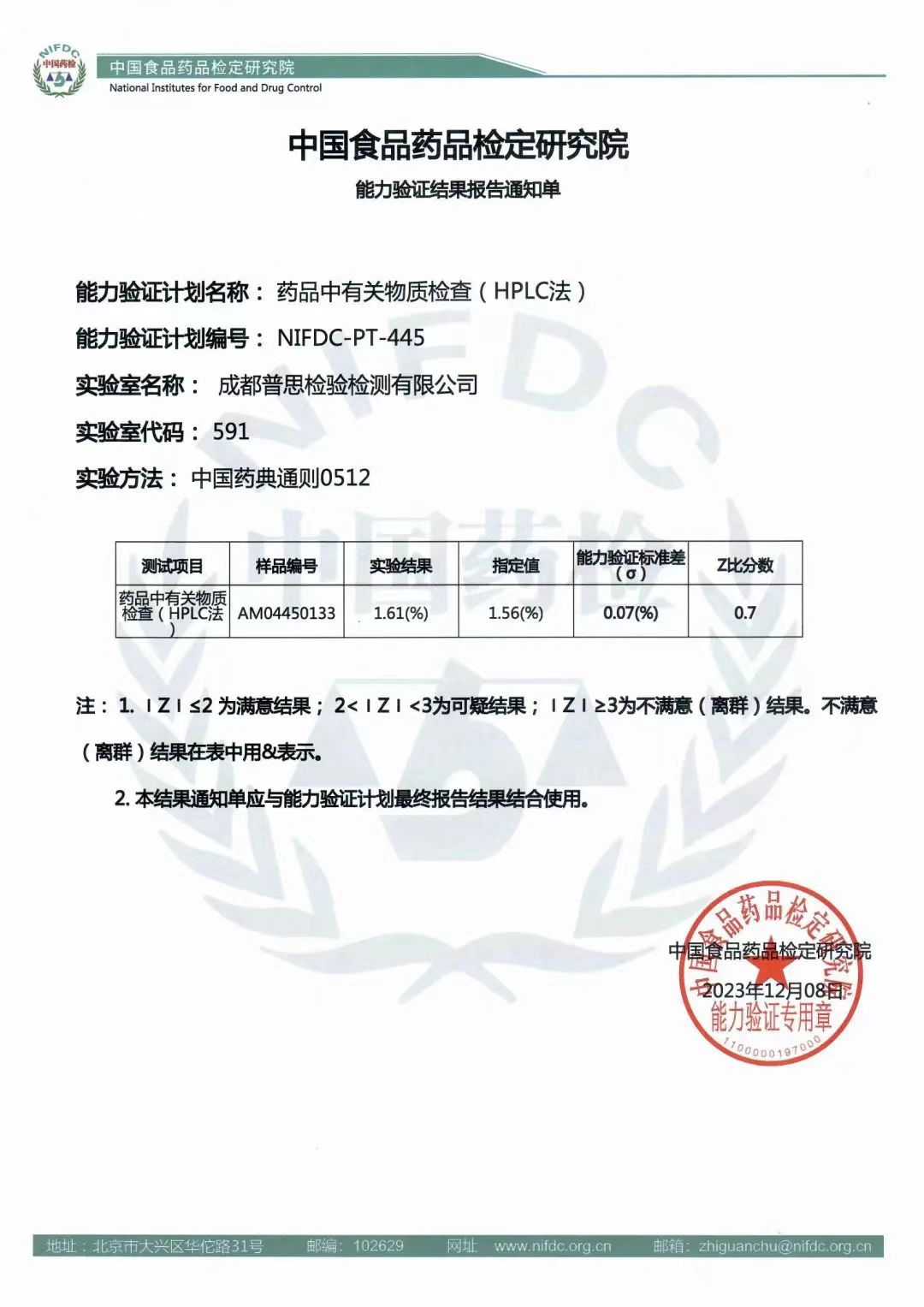 成都普思順利通過中檢院藥品中有關物質檢查(HPLC法)能力驗證